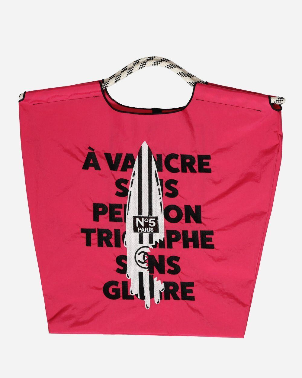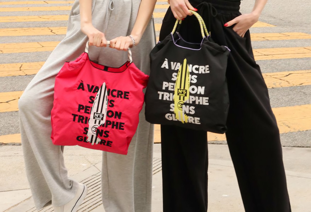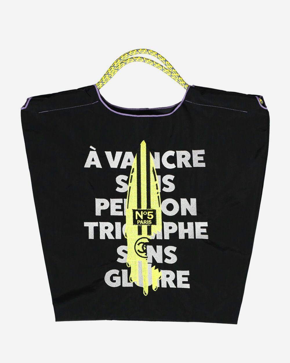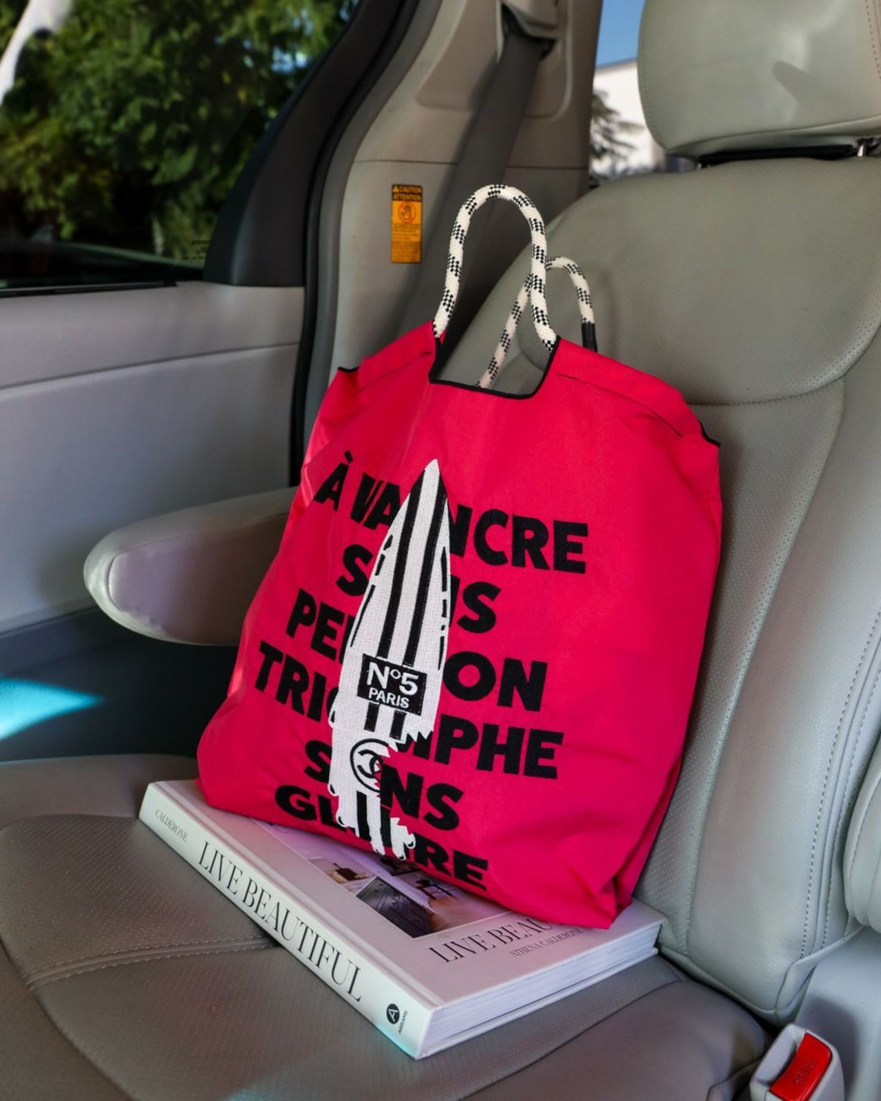 ロゴとサーフボードのデザインが特徴的なトートバッグ